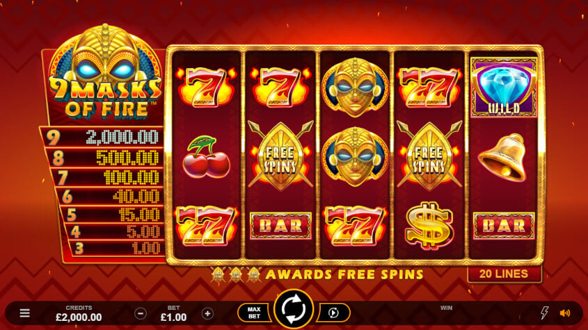 - 9 Masks of Fire มีเส้นการเดิมพันทั้งหมด 20 เส้นและผู้เล่นสามารถเดิมพันได้ตั้งแต่ 20p ต่อการหมุน