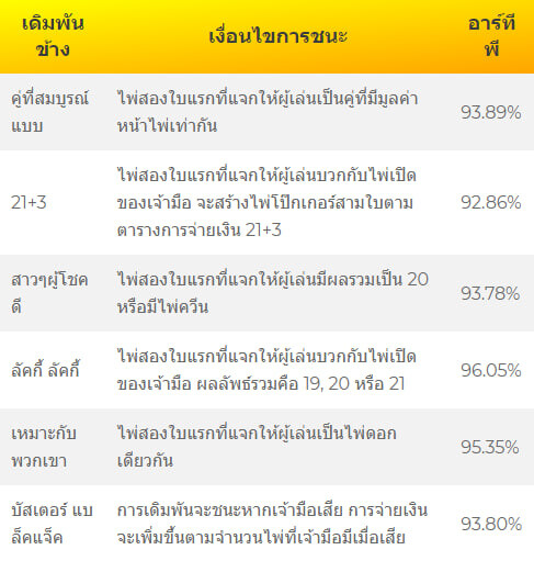 Blackjack+ นำเสนอการเดิมพันข้างเคียงหลายแบบ โดยแต่ละแบบมีกฎและการจ่ายเงินที่แตกต่างกัน: