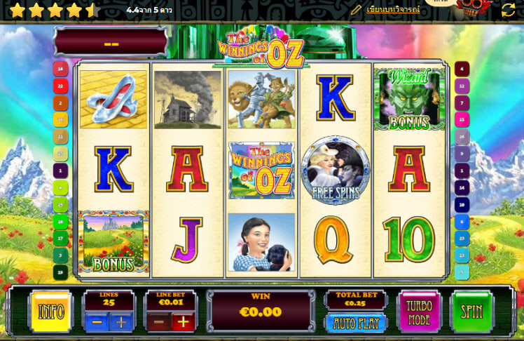 คุณเดินเตร่ไปตามถนนอิฐสีเหลือง ท่ามกลางทัศนียภาพอันหลากสีสันและสิ่งมีชีวิตประหลาด ทุกย่างก้าวจะนำคุณเข้าใกล้เป้าหมายของคุณที่เมืองมรกตและพ่อมดที่จะพาคุณกลับบ้าน ฉากนี้อาจดูคุ้นเคย เพราะเป็นฉากจากภาพยนตร์ฟอร์มยักษ์เรื่อง Wizard of Oz เรื่องราวเกี่ยวกับเวทมนตร์ ความมหัศจรรย์ และความสำคัญของบ้านที่อบอุ่นหัวใจแต่ชวนสับสนเล็กน้อย ซึ่งเกิดขึ้นในโลกที่เต็มไปด้วยมนต์เสน่ห์ ตอนนี้คุณก็สามารถเพลิดเพลินไปกับดินแดนแห่งออซได้แล้ว ง่ายและสนุกด้วยบริการจาก Rival เพียงโหลดเบราว์เซอร์อินเทอร์เน็ตของคุณและเริ่มเล่น Wizard of Oz Slots
