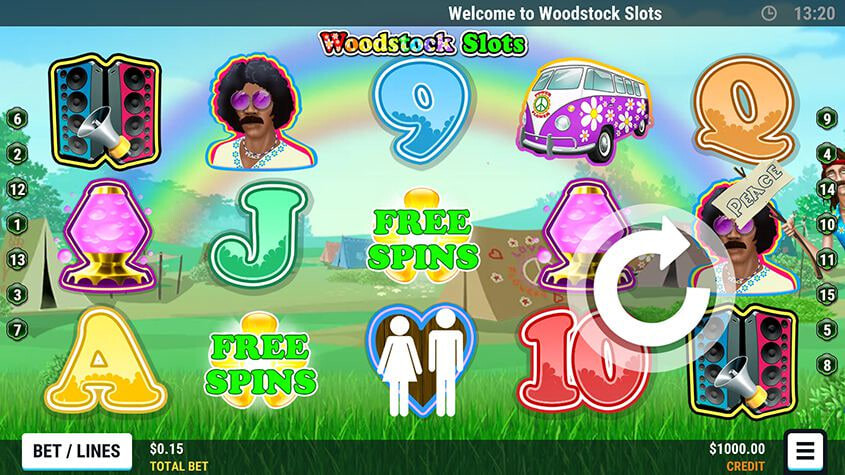 เดโมเล่นฟรีนี้ มีธีมปาร์ตี้ยุค 1960 ตามงาน Woodstock Music and Art Fair ในตำนาน ซึ่งเรียกกันทั่วไปว่า Woodstock เป็นเทศกาลดนตรีที่จัดขึ้นในช่วงฤดูร้อนปี 1969 ในนิวยอร์ก และจัดขึ้นเป็นเวลา 3 วันแห่งดนตรีและสันติภาพ นี่คือเหตุผลที่คุณจะพบสัญลักษณ์สันติภาพบนรีลพร้อมกับจิมิ เฮนดริกซ์ ซึ่งเป็นศิลปินคนสุดท้ายที่แสดงในเทศกาล สัญลักษณ์อื่นๆ ได้แก่ ลำโพง โคมไฟลาวา และไอคอนรูปหัวใจซึ่งเป็นสัญลักษณ์ของความรักอิสระในสมัยนั้น นอกจากนี้ยังมีฮิปปี้แอนิเมชั่นที่ดูมึนเมาปรากฏตัวพร้อมกับเพลงประกอบกีตาร์สุดชิลและเสียงตะโกนว่า "เย้!" มากมาย หากคุณชอบบรรยากาศของสล็อตนี้ คุณอาจต้องการลองเล่นPick A Pot of Gold จาก Slot Factory