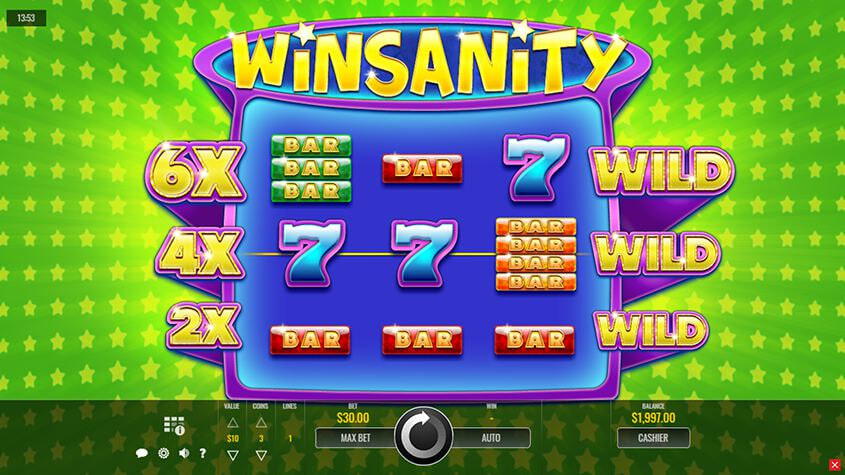 Winsanity ไม่มีคุณสมบัติโบนัส แต่ตัวคูณสามารถให้รางวัลที่คุ้มค่าได้ ควรจำไว้ว่าตัวคูณจะจ่ายแม้ว่าจะปรากฏโดยไม่มีสัญลักษณ์ที่ตรงกัน ตัวอย่างเช่น หาก X6 ปรากฏบนเส้นกึ่งกลางและไม่มีสัญลักษณ์อื่นปรากฏ คุณจะได้รับเงินเดิมพัน X6