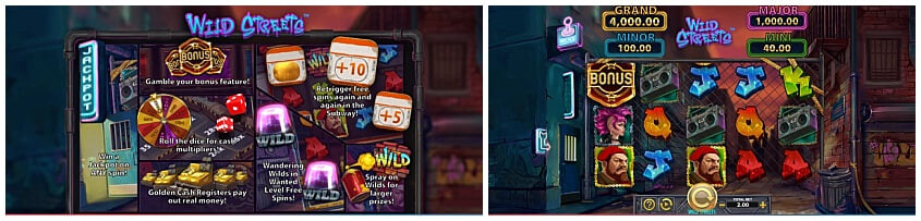 เข้าสู่ตรอกมืดของ Wild Streets และเตรียมดื่มด่ำไปกับความตื่นเต้นเร้าใจของ Jackpot Arcade และบรรยากาศของแก๊งข้างถนน คุณจะได้ทัวร์กราฟฟิตี้ผ่าน 3 แถว 5 วงล้อไร้กรอบและ 20 ไลน์รางวัลคงที่ คุณจะหมุนวงล้อตามเสียงอิเล็กทรอนิกส์จากเครื่องยิงสลัมที่อยู่ใกล้ๆ