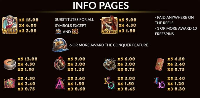 เกมนี้มีสัญลักษณ์ที่เป็นเรื่องราวเกี่ยวกับโจรสลัดถึง 9 สัญลักษณ์ด้วยกัน ได้แก่ สัญลักษณ์ Wild นักรบฟ้า สัญลักษณ์ Scatter นักรบแดง และยังมีอีกสัญลักษณ์หนึ่งก็คือสัญลักษณ์โบนัส รูปเรือ สัญลักษณ์โคลอสเซี่ยม สัญลักษณ์นักรบ สัญลักษณ์ช้างสัญลักษณ์โล่ สัญลักษณ์ธง สัญลักษณ์A K Q JและQ แต่ละมีอัตราการจ่ายรางวัลที่แตกต่างกันออกไป