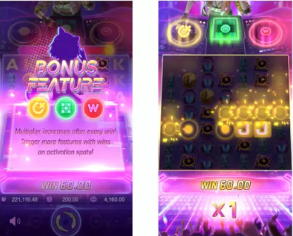 - ในตอนเริ่มฟีเจอร์โบนัส, ฟีเจอร์ระเบิดเบส, ฟีเจอร์การแปลงมวล และฟีเจอร์ Wild ดีเจย์จะเปิดใช้งานทั้งหมด