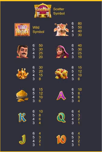 - ภาพสัญลักษณ์ของการเล่นเกม Ganesha Fortune จะประกอบไปด้วย ภาพสัญลักษณ์ รูปวัว , รูปผู้ชาย , รูปผู้หญิง , รูปแจกันเทียน , รูปพวงมาลัย , รูปผงขมิ้น , รูปตัวอักษร A , รูปตัวอักษร K , รูปตัวอักษร Q และรูปตัวเลข 10 ที่จะปรากฏขึ้นมาภายในเกม ทั้งนี้ในแต่ละภาพสัญลักษณ์ที่จะแสดงขึ้นมาเหล่านี้ มักจะมีอัตราการจ่ายเงินค่อนข้างแตกต่างกันออกไป ดังต่อไปนี้
