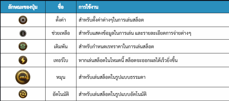 Auto Spin: แตะเพื่อเริ่มการหมุนอัตโนมัติ และคลิกอีกครั้งเพื่อหยุดการหมุนอัตโนมัติ. เลือกเดิมพัน: แตะเพื่อปรับการเดิมพัน.