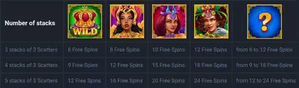 ก่อนเริ่มฟรีสปิน ป๊อปอัพจะแสดงตัวเลือกคุณลักษณะ 5 รายการปรากฏขึ้น ยิ่งมีสัญลักษณ์ Scatter ซ้อนกันบนวงล้อมากเท่าใด ตัวเลือกที่ทำกำไรก็จะยิ่งมีมากขึ้นเท่านั้น ในป๊อปอัพ คุณต้องเลือกสัญลักษณ์สแต็ค ในระหว่างการหมุนฟรี เฉพาะสัญลักษณ์นี้เท่านั้นที่จะปรากฏในกอง จำนวนฟรีสปินถูกกำหนดโดยสัญลักษณ์กองที่เลือกดังแสดงในตารางด้านล่าง