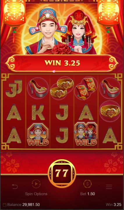 - สัญลักษณ์ เจ้าบ่าว มีตัวอักษร WILD เป็นสัญลักษณ์ Wild จะเริ่มอัตราการจ่ายเมื่อสัญลักษณ์ปรากฏขึ้น 3, 4 หรือ 5 จนถึง 10 ในตำแหน่งไลน์เดิมพัน ติดต่อกันจากช่องซ้ายไปขวา จะได้รับรางวัล 30 – 3000
