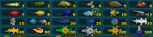 ภาพสัญลักษณ์ของสล็อต XO Fish Hunting:Yao Qian Shu จะประกอบไปด้วย สัญลักษณ์ปลาตุ๊กแก,สัญลักษณ์ปลารายเขียว,สัญลักษณ์ปลาเหลืองรายฟ้า,สัญลักษณ์ปลาตาโต,สัญลักษณ์ปลาตัวราย,สัญลักษณ์ปลาการ์ตูน,สัญลักษณ์ปลาจุดแดง,สัญลักษณ์ปลาจุดเหลือง,สัญลักษณ์ปลาน้ำเงิน,สัญลักษณ์ปลาหัวไฟ และอื่นๆอีกมากมาย