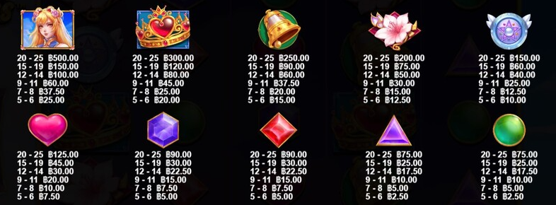 - เจ้าหญิง – จ่าย 50x สำหรับคลัสเตอร์สัญลักษณ์ 20+ สัญลักษณ์