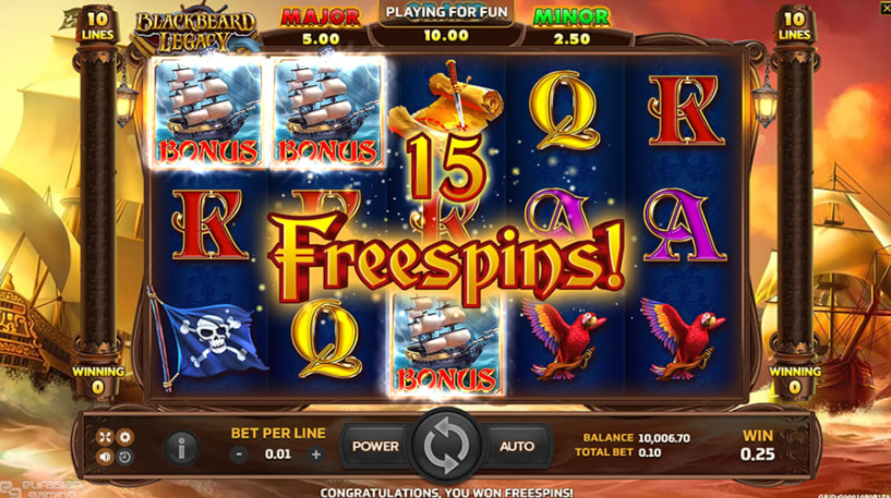 และ สัญลักษณ์ Scatter ของเกมนี้ จะเป็นรูปเรือใบ มีคำว่า Bonus เมื่อสัญลักษณ์นี้ ปรากฏบนช่องใดก็ตาม ตั้งแต่ 3 ช่องขึ้นไป รับ Free Spin 15 ครั้ง ทันที คุณสมบัติ ฟรีสปิน สามารถถูกเพิ่มใหม่ได้อย่างไม่จำกัดในระหว่างฟรีสปิน และฟรีสปินที่ได้รับใหม่จะถูกเพิ่มเข้าไปในส่วนที่เหลือ ยิ่งไปกว่านั้นในระหว่างที่เล่นเกมและในช่วงฟรีสปิน หากคุณได้รับสัญลักษณ์โบนัส 6 ตัวขึ้นไป คุณสมบัติ Mystic Spin จะทำงานด้วยการหมุน 5 ครั้งและได้รับรางวัล สำหรับการหมุนแบบ Mystic Spin แต่ละครั้งคุณจะมีโอกาสได้รับสัญลักษณ์โบนัสมากขึ้น (เมื่อได้รับแล้วสัญลักษณ์โบนัสจะอยู่ในเซลล์และไม่หมุนอีกต่อไป) หรือชนะการหมุนแบบลึกลับ สัญลักษณ์โบนัสแต่ละตัวมีมูลค่าการชนะของตัวเอง ซึ่งขึ้นอยู่กับโหมดเกม เมื่อคุณสมบัติถูกเรียกใช้ และทั้งหมดจะถูกเพิ่มเข้ามาในตอนท้ายของคุณสมบัติ