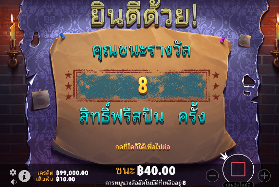 สัญลักษณ์ SCATTER ปรากฏ 3 ตัวขึ้นไป เพื่อสั่งให้ฟีเจอร์ฟรีสปินทำงานและรับฟรีสปิน 8 ครั้งเป็นรางวัล สัญลักษณ์ SCATTER แต่ละตัวก็ทาให้พี่เจอร์ทางานจะทาให้เกมจ่ายเนวิลของเดิมพันรวม ในระหว่างรอบ สัญลักษณ์ WILD จะค้างอยู่บนหน้าจอระหว่างฟรีสปิน