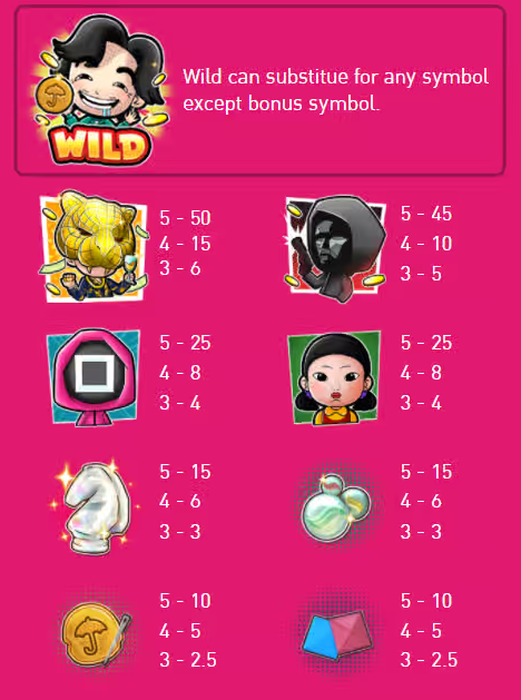 เกมสล็อต SquidToon sca68-th จะมีไลน์ที่ชนะรางวัลภายในเกมนี้ทั้งหมด 243 ไลน์เดิมพัน โดยการชนะรางวัลจะเรียงสัญลักษณ์จากซ้ายไปขวาเท่านั้น สัญลักษณ์ต้องเรียงเหมือนกันอย่างน้อย 3 ตัว และมากสุด 5 ตัว การหมุน 1 ครั้ง สามารถชนะได้มากกว่า 1 ไลน์เดิมพัน จึงจะถือว่าชนะการเดิมพันและคำนวณเงินรางวัล