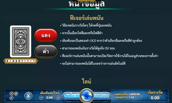 GAMEBLE FEATURE : คุณสมบัติ ไพ่ดำ ไพ่แดง เป็นโหมดพิเศษภายในเกม เป็นการลงพนันรางวัลคือให้กดที่ปุ่มลงพนัน จากนั้นเลือกไพ่สีแดงหรือไพ่สีดำ เดิมพันจะเป็นสองเท่า (x2) หากว่าตัวเลือกสีแดงหรือสีดำถูกต้อง สามารถลงพนันเงินรางวัลได้สูงถึง 5 รอบ ฟีเจอร์การเล่นพนันนั้นสามารถ เปิด/ปิด การใช้งานได้ในเมนูส่วนของการตั้งค่า และจะไม่สามารถพนันได้ในระหว่างการเล่น auto sca68-th