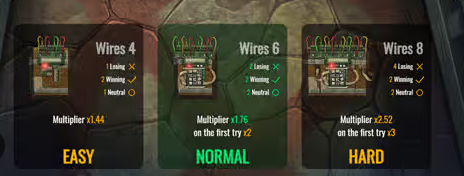 เกมนี้มีโหมดความยาก 3 โหมด (ง่าย, ปกติ, ยาก) ซึ่งแตกต่างกันไปตามปัจจัยการชนะและจำนวนสาย ง่าย – 1.44, ปกติ – 1.76/2 , ยาก- 2.52/3 หากในโหมดปกติ คุณเลือกสายที่ชนะจาก 1 ครั้ง ตัวคูณที่ชนะจะเพิ่มขึ้นเป็น 2 หากอยู่ในโหมดฮาร์ด คุณ : เลือกสายที่ชนะจาก 1 ครั้ง ตัวคูณที่ชนะจะเพิ่มขึ้นเป็น 3เกมยังมีสายสามประเภท ชนะ , แพ้ , เป็นกลาง ถ้าตัดเส้นชัยก็ชนะ แพ้-แพ้ หากคุณตัดลวดที่เป็นกลาง คุณยังคงมีโอกาสชนะ แต่ตัวคูณจะลดลง