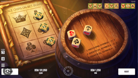 - หากสัญลักษณ์ที่คุณเดิมพัน เมื่อตกลงไปบนลูกเต๋า คุณจะได้รับรางวัล ซึ่งจำนวนจะขึ้นอยู่กับจำนวนสัญลักษณ์ที่เดาได้ รวมถึงจำนวนของแต่ละสัญลักษณ์ที่เดาได้ ตัวอย่างเช่น: 1 สัญลักษณ์ – อัตราส่วนการจ่ายเงิน 1:1, 2 สัญลักษณ์ที่เหมือนกัน – 2:1, สัญลักษณ์ที่เหมือนกันสามอัน – 3:1 เงินเดิมพันสำหรับสัญลักษณ์ที่ชนะจะถูกส่งคืน