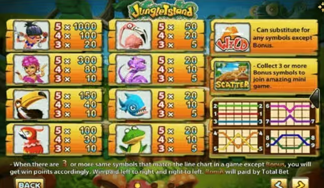 สัญลักษณ์ในเกม Jungle จะมี ปลาปิรันยา, กบ, ชนเผ่า, งู, นกกระยาง, นกหัวขวาน, นกแก้ว, ภูเขาไฟ, เสือดาว สัญลักษณ์เหล่านี้ ก็เอามาจากเกม จังเกิล นั่นเอง มีชนเผาต่างๆให้เราได้ดู รวมไปถึงการใช้ชีวิตในเกาะที่มีป่าไม้ ภูเขา และสัตว์ต่างๆอีกมากมายเป็น 10000 ชีวิตเลยก็ว่าได้ และเกมนี้ยังเห็นการใช้ชีวิตต่างๆของพวกเขาอีกด้วย sca68-th