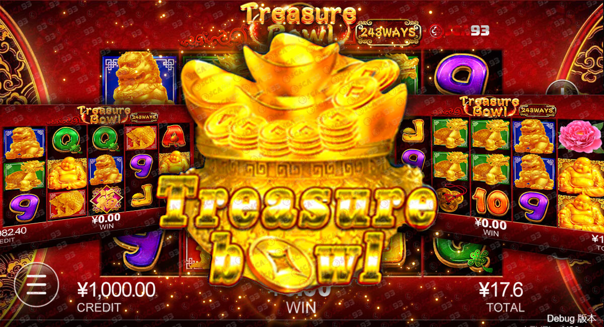 หน้าจอของ Treasure Bowl จะแสดงเครื่องหมายที่เกี่ยวข้องกับวัฒนธรรมจีน เช่น กระถาง, ไอ้ตัว, ลูกเต๋า, สัตว์ต่างๆ และอื่นๆ โดยมีรูปแบบการเดิมพันแบบ 5x3 และจะมีไลน์การเดิมพันทั้งหมด 243 ไลน์